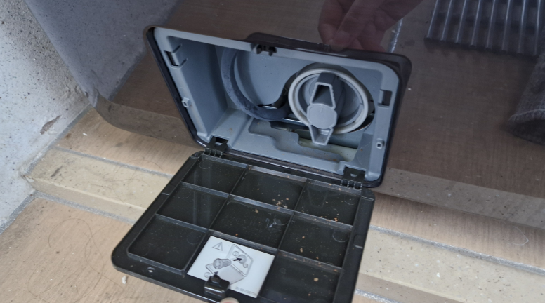 - 커버 열고 → 작은 호스로 물 빼낸 후 → 필터를 반시계로 돌려 분리